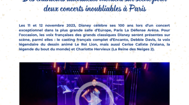 Les 11 et 12 novembre 2023, Disney célèbre ses 100 ans lors d’un concert exceptionnel dans la plus grande salle d’Europe, Paris La Défense Aréna. Pour l’occasion, les voix françaises des grands classiques Disney seront présentes sur scène, parmi elles : le casting français complet d’Encanto, Debbie Davis, la voix légendaire du dessin animé Le Roi Lion, mais aussi Cerise Calixte (Vaiana, la légende du bout du monde) et Charlotte Hervieux (La Reine des Neiges 2).