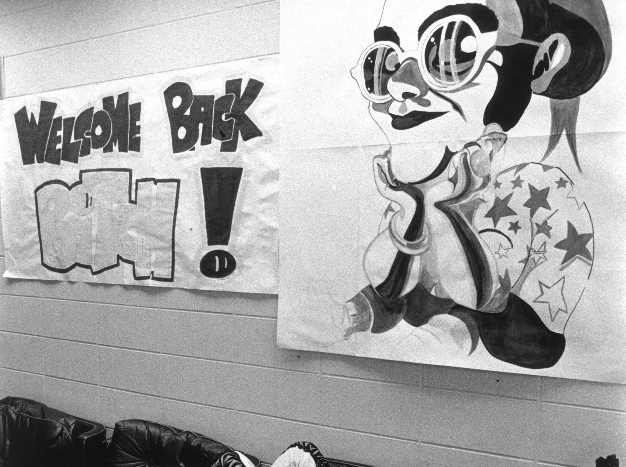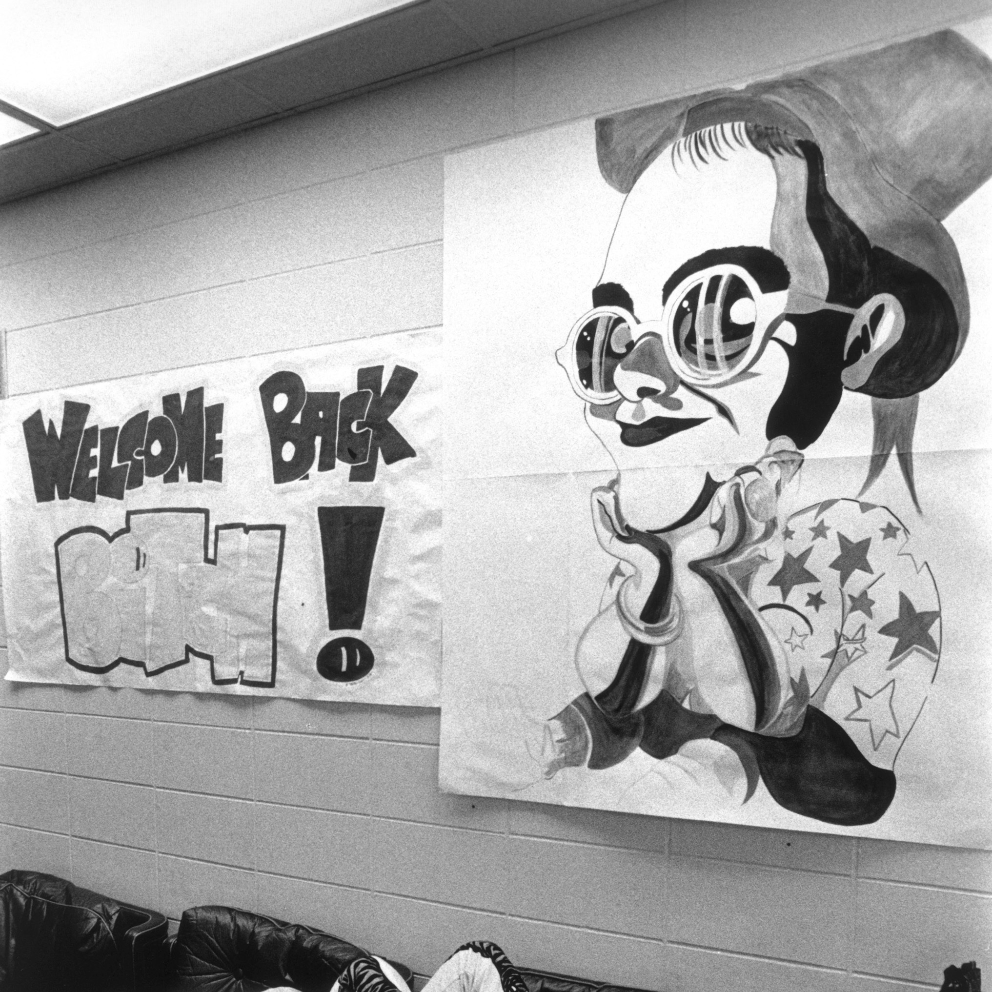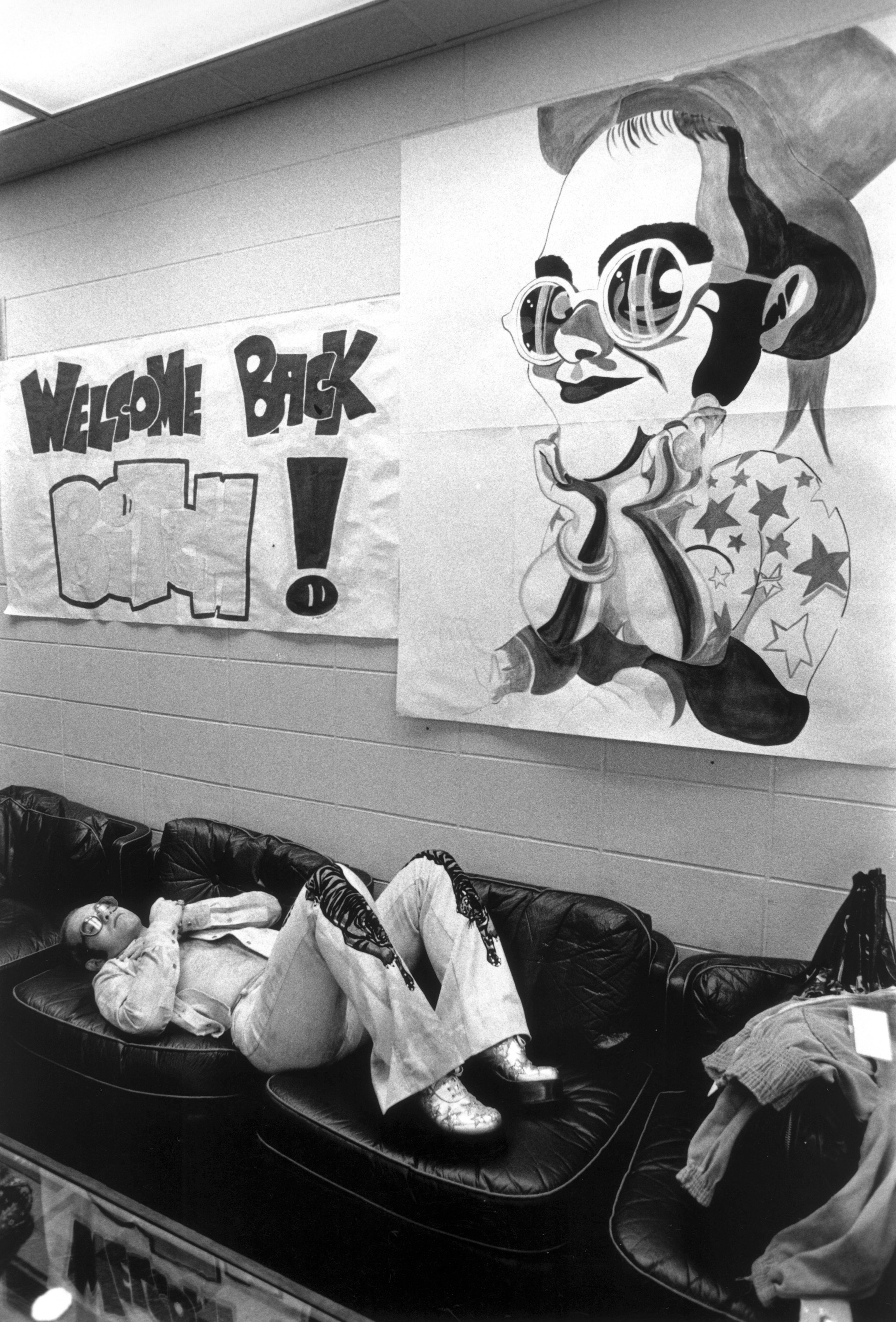 Elton se détend dans les coulisses après son concert historique de 1974 au Madison Square Garden. (Sam Emerson)