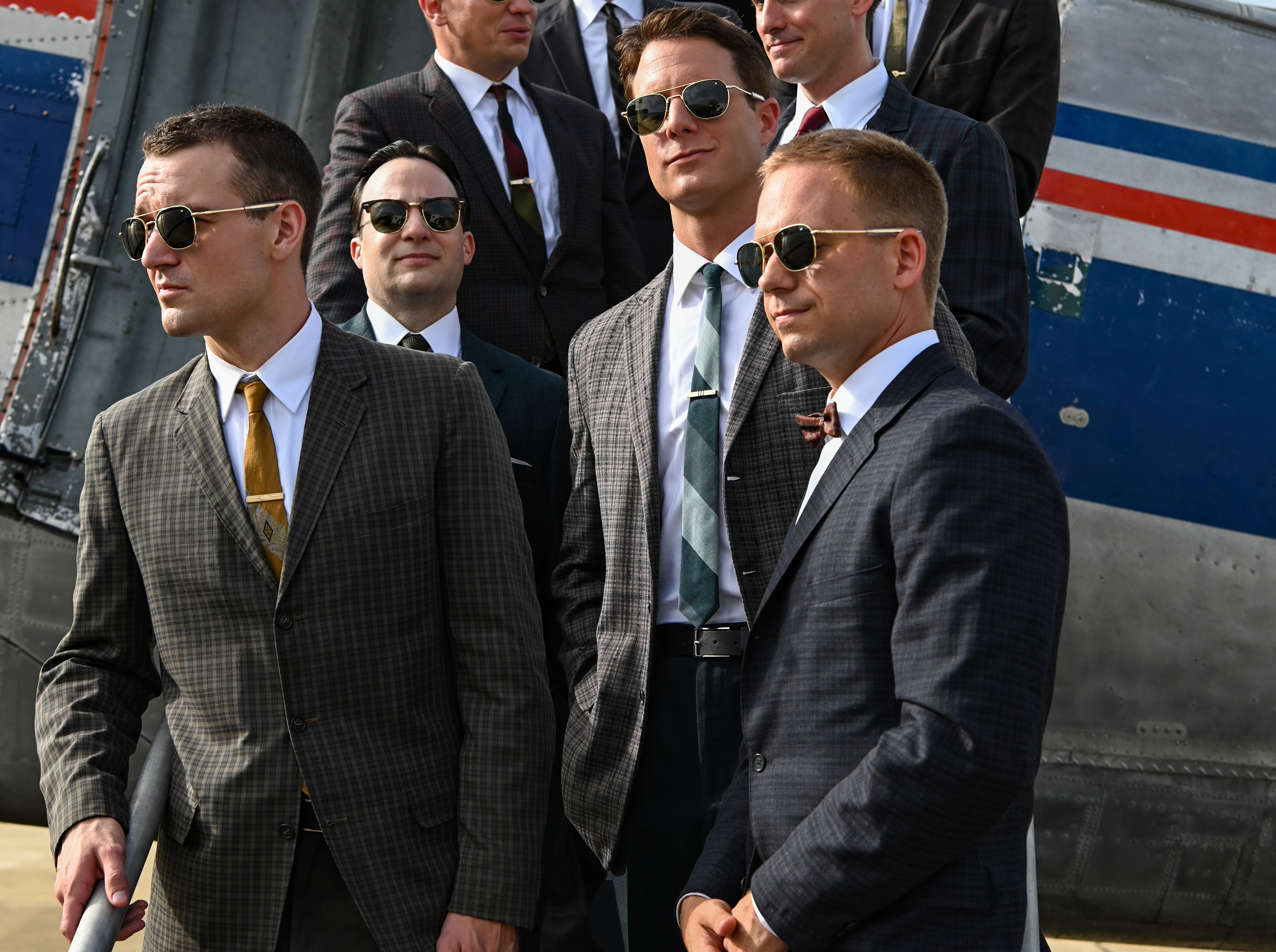 Left row front to back: Micah Stock as Deke Slayton, Danny Strong as John ‘Shorty’ Powers, Michael Trotter as Gus Grissom, Aaron Staton as Wally Schirra. Right row front to back: Patrick J. Adams as John Glenn, Jake McDorman as Alan Shepard, Colin O'Donoghue as Gordon Cooper and James Lafferty as Scott Carpenter in National Geographic's THE RIGHT STUFF on Disney+. (Credit: National Geographic/Gene Page)